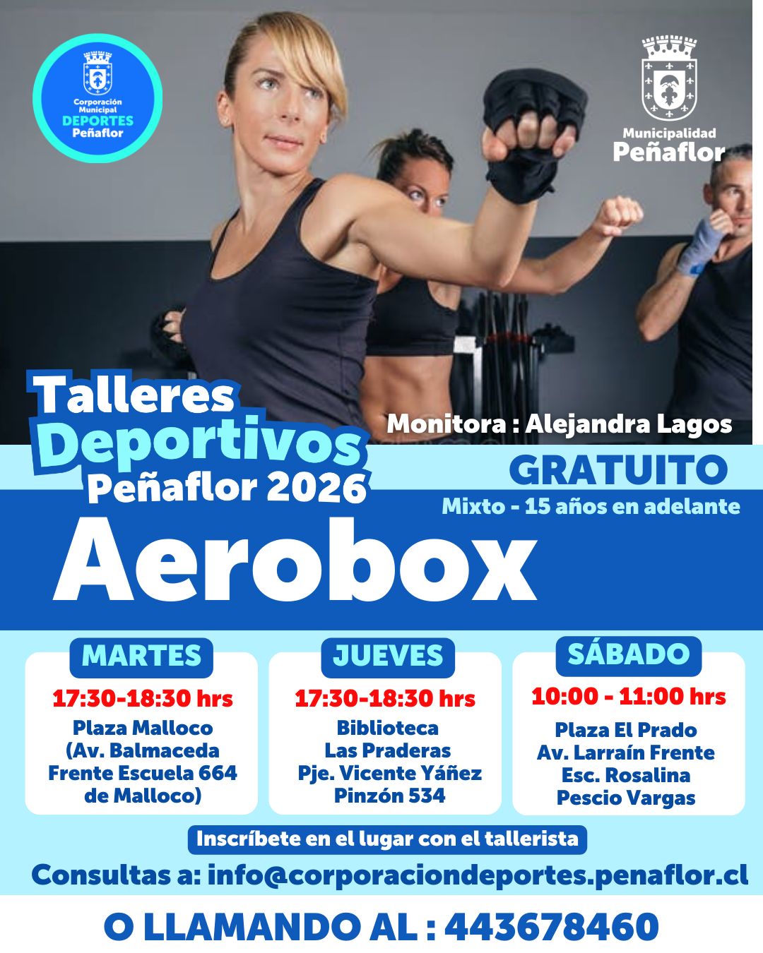 La Municipalidad de Peñaflor, junto a la Corporación Municipal de Deportes de Peñaflor, invita a la comunidad a participar en el Taller Deportivo de Aerobox 2026, una actividad gratuita que combina ejercicios aeróbicos con movimientos de boxeo para mejorar la resistencia, coordinación y condición física.